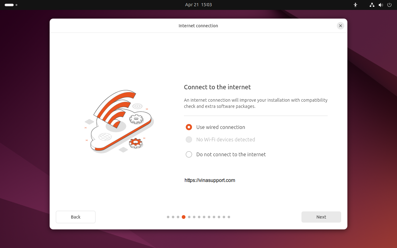 Kết nối tới mạng Internet. Mục đích của tùy chọn này là bạn có một kết nối tới Internet trong quá trình cài đặt, để tải và cài những bản vá mới nhất.