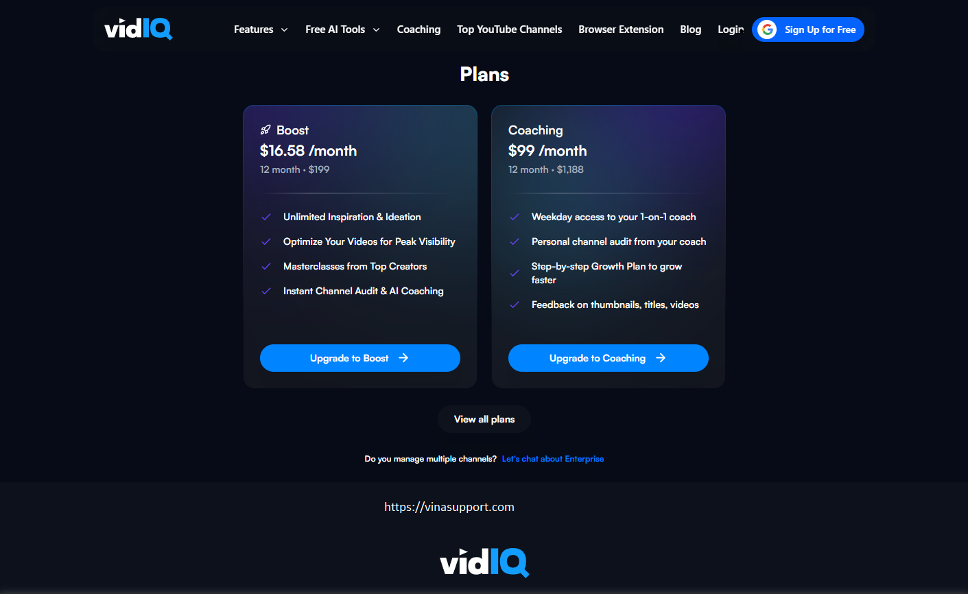 Lời khuyên: Nếu bạn là người mới, hãy bắt đầu với gói Free. Khi đã thấy được hiệu quả, hãy mạnh dạn đầu tư vào gói Boost và đừng quên sử dụng vidIQ promo code để tiết kiệm chi phí nhé!